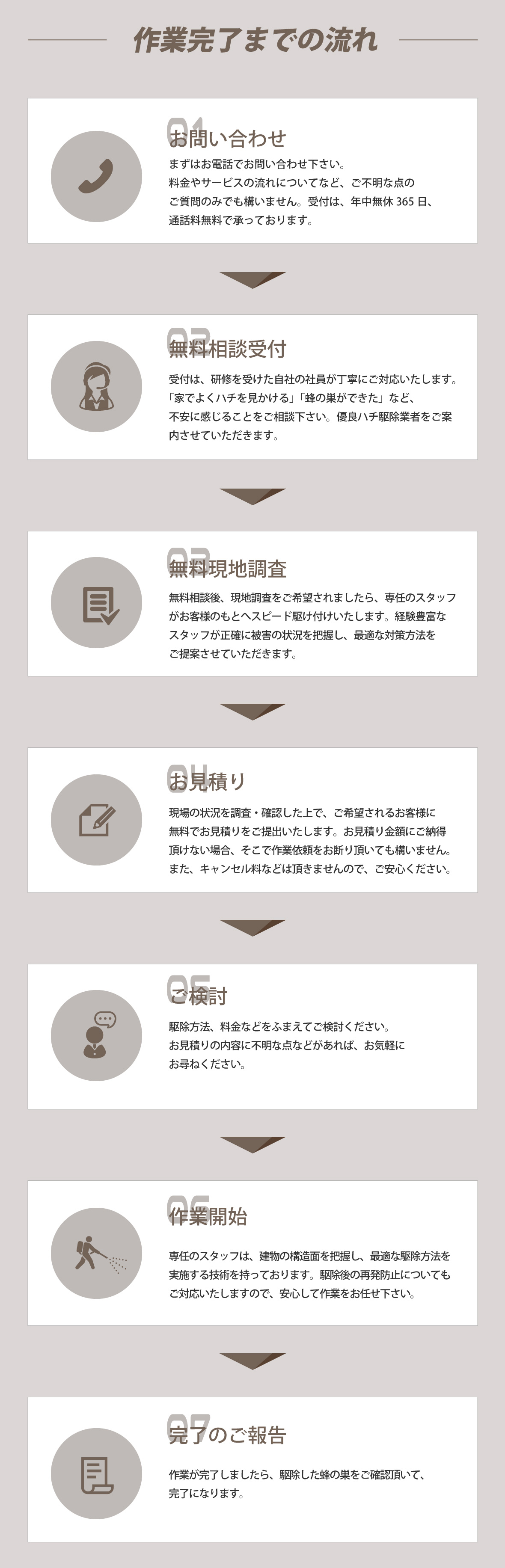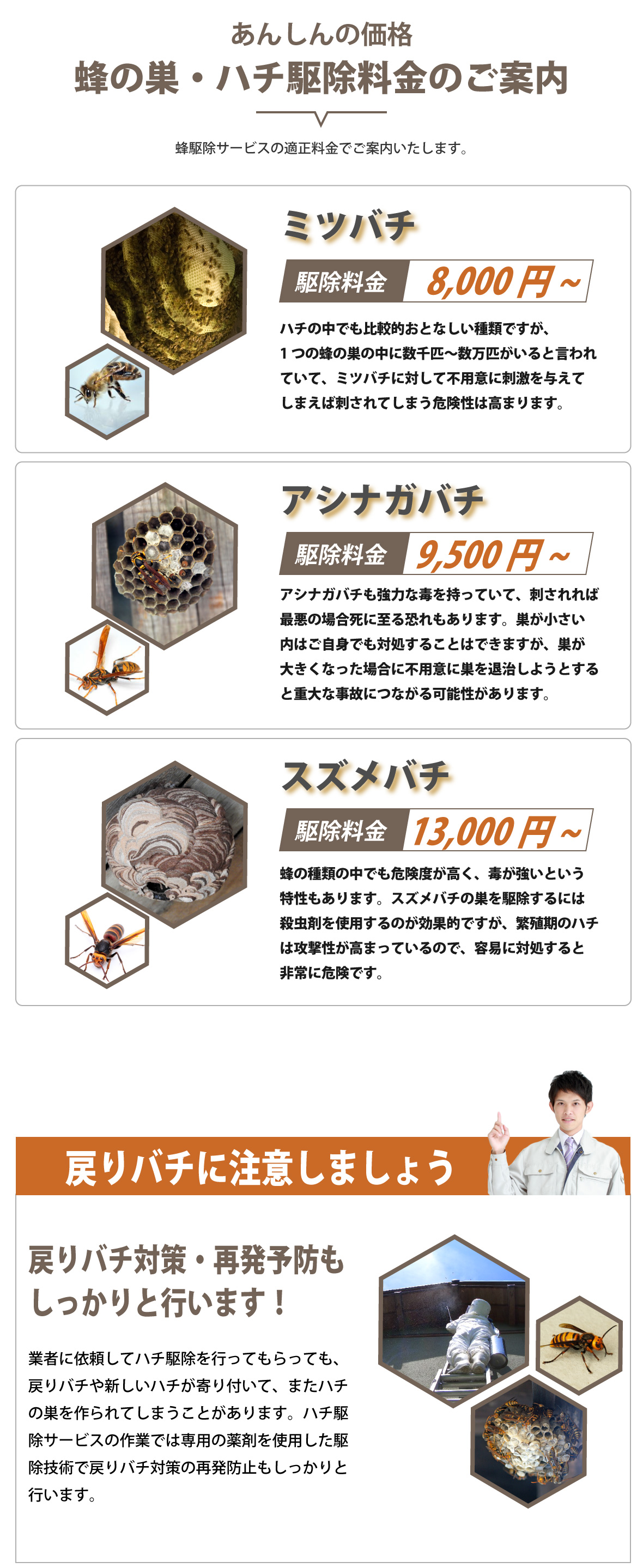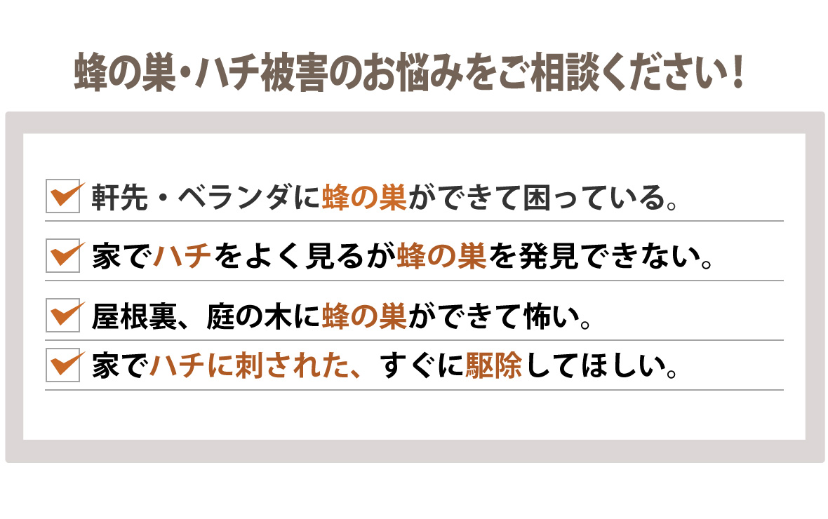 電話をかける(click)ハチ駆除をお考えの際は、プロのハチ駆除業者に依頼することをおすすめいたします。ベランダ、軒下、家の玄関や庭などにハチの巣が作られてしまうと、ハチが部屋の中に入ってしまわないか、ハチに刺されてしまわないかと心配ですよね。また家の周りで蜂が飛んでいると、お隣やご近所の方にもハチ被害でトラブル、ご迷惑をお掛けすることにもなってしまいます。そうなってしまう前にハチ駆除会社に依頼をしてスムーズに解決してしまいものです。それでは、多くの業者の中からどの業者に依頼すればいいのでしょうか?依頼を検討するにあたり、料金や対応の早さ・正確さ、アフターサービスなど気になることは多くありますよね。そこで少しでも低価格、早く、安全、安心に蜂の巣駆除を終わらせるために業者選びで知っておきたいポイントをご紹介します。まず、ハチ駆除料金を比較する際は事前に現地調査を行ってもらいましょう。駆除にかかる費用は、巣の大きさ・場所・高さ、ハチの種類によって変わってきます。また、蜂の巣は軒先や窓際といった場所だけでなく屋根裏(天井裏)、床下といった見つけにくい場所に作られることもあります。そのため正確な見積もりを提示してもらうためにも十分な現地調査は欠かせません。また、駆除の値段はお客様によってそれぞれなので、見積もり価格が業界の相場・適正料金か見極めるのも難しいことかと思います。よくあるトラブルは現地調査が不十分で追加工事・追加料金が発生してしまった、作業費用と清掃費用が別途料金で請求金額が見積りから大きく増えてしまったというものです。そこで見積もりの詳細(内訳)を納得できるまで丁寧にわかりやすく説明してくれる業者が信頼出来る優良業者といえます。また、今日中(本日中)に、翌日にでもハチ駆除を終わらせたいというお客様もみえることかと思います。そこで依頼から即日対応・即日解決・即日駆除ができる業者をおすすめいたします。そして、徹底的にハチ退治、ハチの巣除去をしてもらうために、蜂の巣駆除会社の実績も確認しておきましょう。ハチ駆除には資格や免許、許可などが必要ないので知識や技術がない素人でも作業ができてしまいます。その際、対応が不十分だと戻りバチや蜂の巣の再発といった問題が起きてしまうこともあります。実績豊富な業者であれば、ハチ駆除の知識や技術を持つ専門家のスタッフが駆除から蜂の巣の撤去・処分、再発防止のケアまで行うことができます。また、口コミやランキングサイトで業者の評判も調べてみましょう。評価の高い人気の業者、おすすめされている業者の具体的な対応や施工例など業者選びの参考になるかと思います。弊社では、ご相談、現地調査、お見積もりまで全て無料でご利用頂けます。現地調査の際は、ご依頼から最短40分で駆けつけ、緊急時にもご対応いたします。ミツバチは10,000円から、アシナガバチは11,000円、スズメバチは13,000円から適正料金でハチ駆除サービスをご案内しております。プロの駆除技術にあわせて専用の薬剤を使用することで徹底的な蜂駆除、蜂の巣の除去から、戻り蜂対策、再発予防までしっかりと行います。また、年中無休365日・通話料無料の相談窓口を設けております。ご相談には研修を受けた専門スタッフがご対応いたしますのでちょっとした質問からでも、お気軽にご相談ください。安心・安全にハチ駆除をしたい、ハチ被害でお悩みの方は、まずは弊社にお問い合わせください。